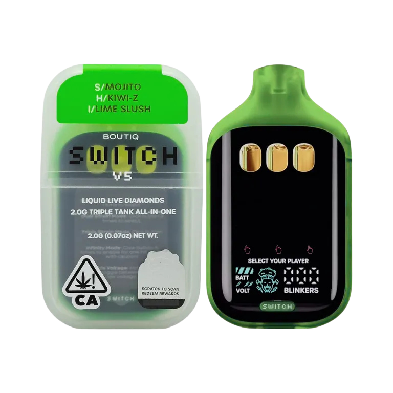 Discover the BOUTIQ Switch V5 – a game-changing innovation in disposable vape technology! This premium device features a pioneering three-chamber design that houses three distinct, freshly crafted flavors in one sleek package: Mojito (Sativa), Kiwi-Z (Hybrid), and Lime Slush (Indica).